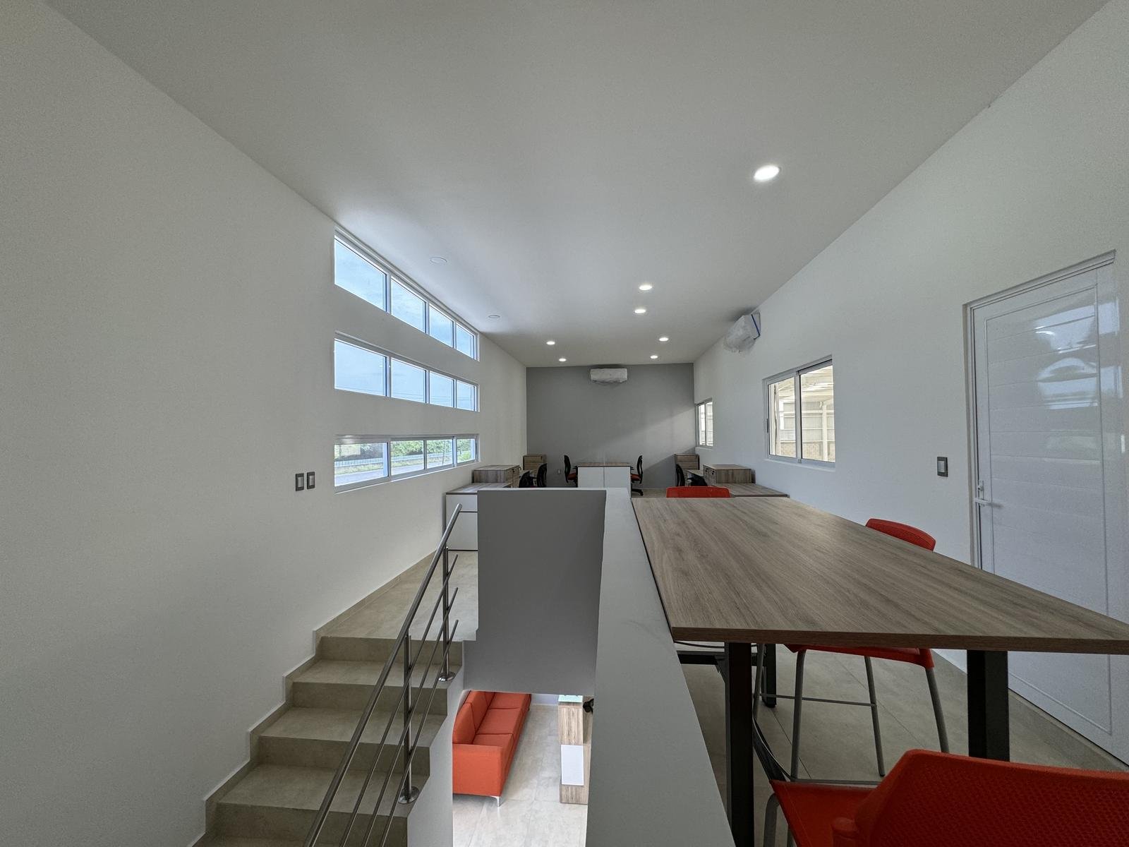 Oficina principal amplia con mesa de juntas y medio baño