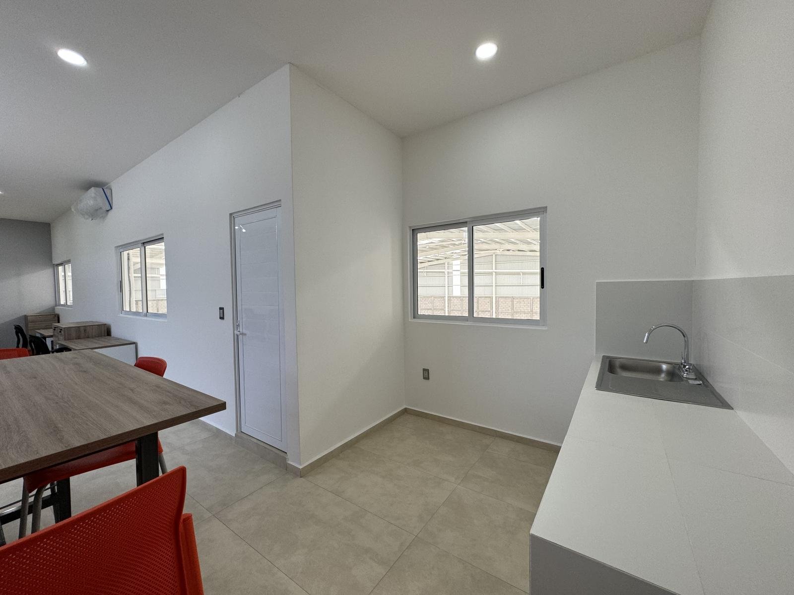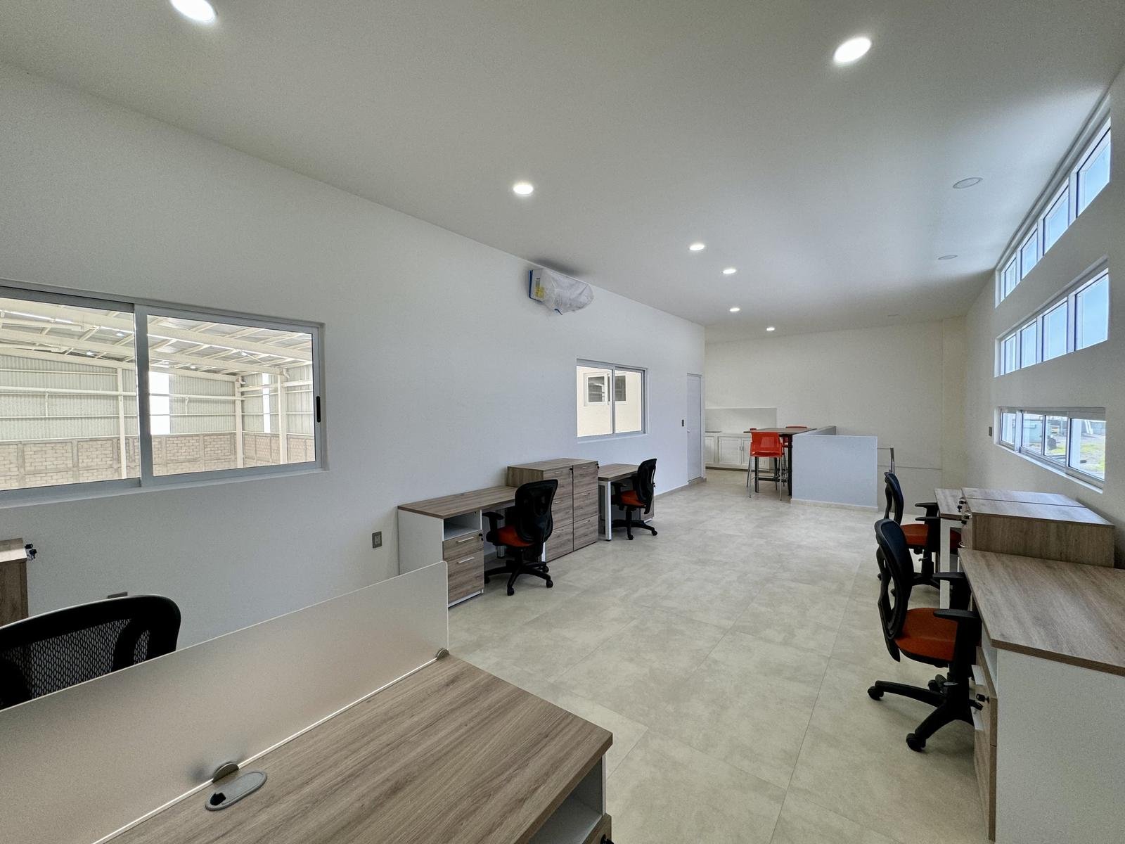 Oficina general amplia con escritorios independientes, archiveros, área de comedor y barra con tarja