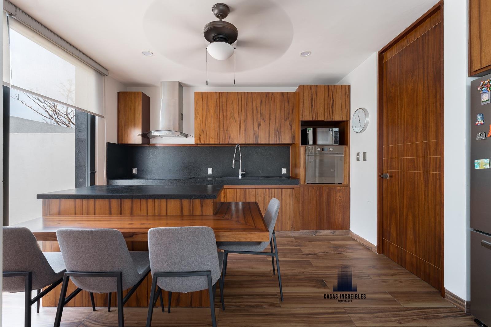 Cocina integral con barra de cuarzo, parrilla, campana, horno electrico, alacena, barra desayunador