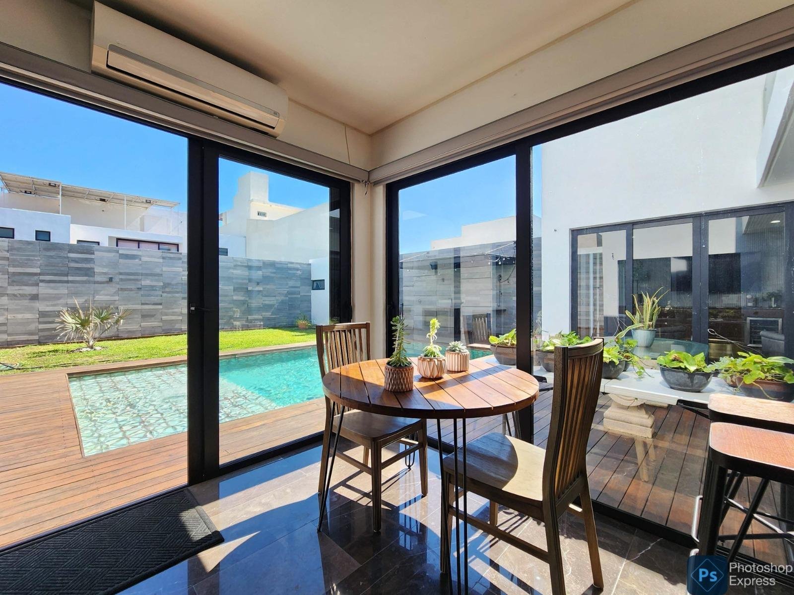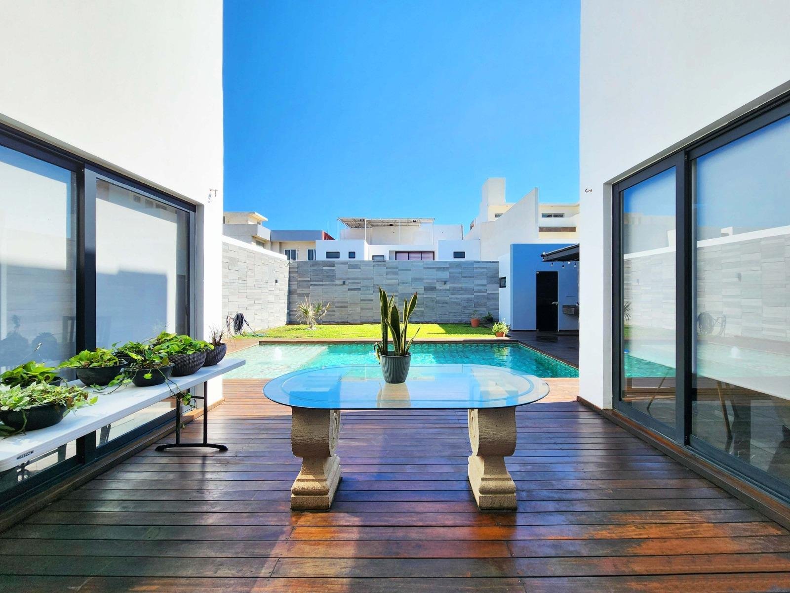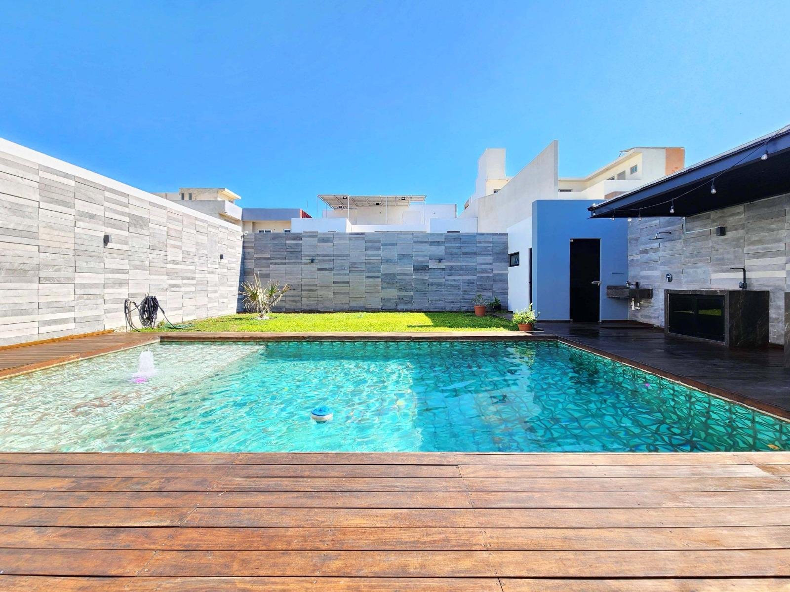 - Alberca con deck de madera, área de asador y baño completo.