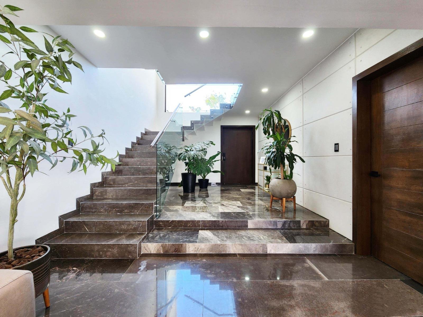- Recibidor de doble altura con muebles de blancos.