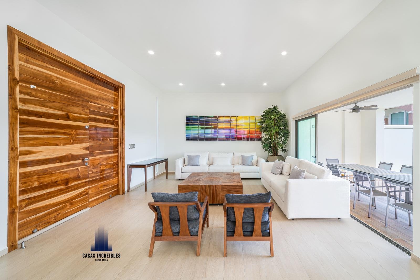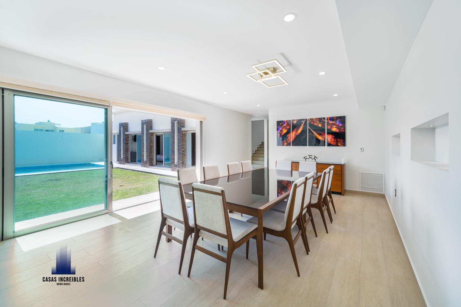 Sala comedor amplios climatizada con Fan & Coil, con vista a jardín y alberca