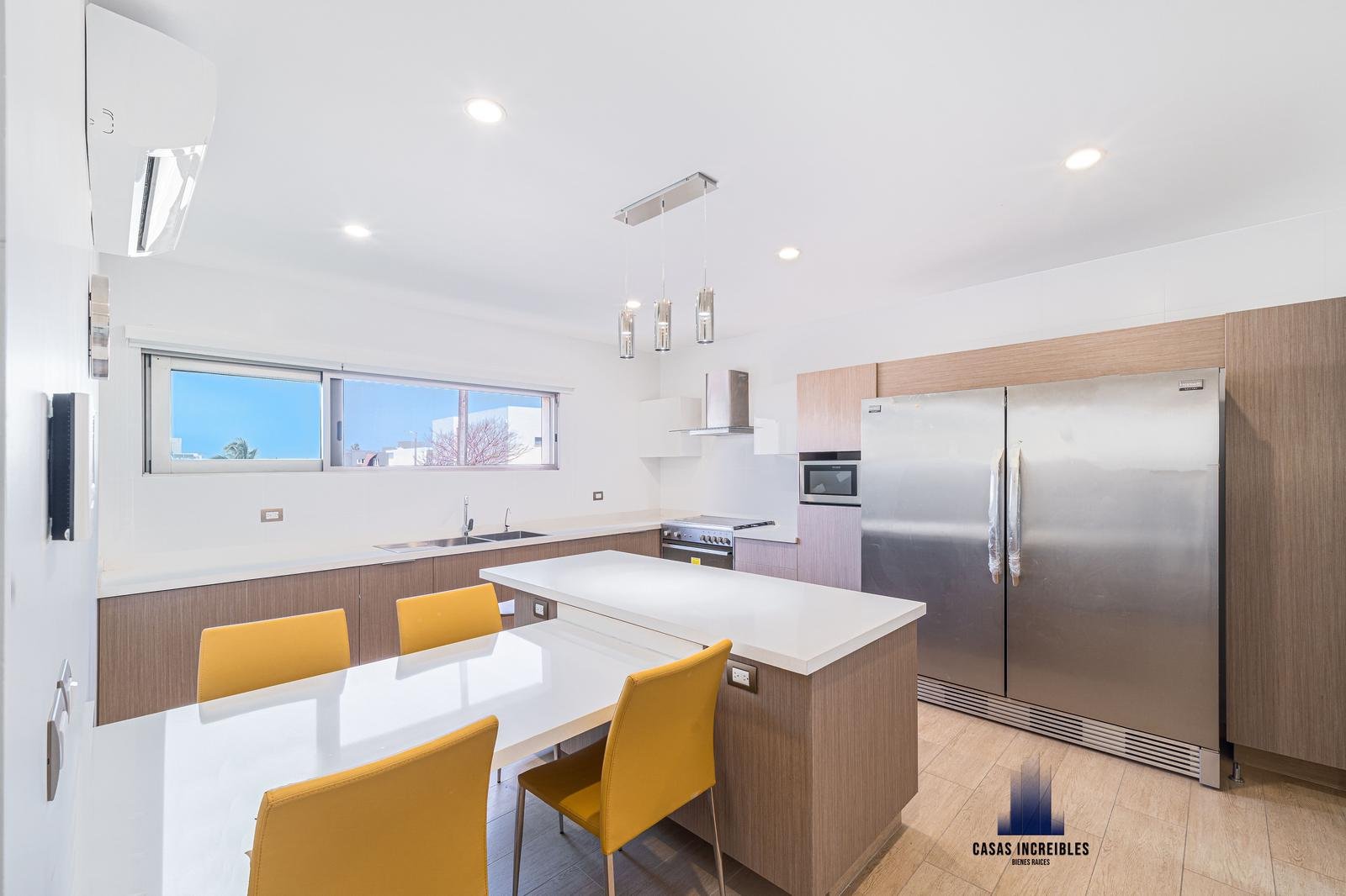 Cocina independiente con desayunador equipada con barra de cuarzo, estufa, campana, refrigerador industrial, horno de microondas, amplia alacena, climatizada y con pantalla