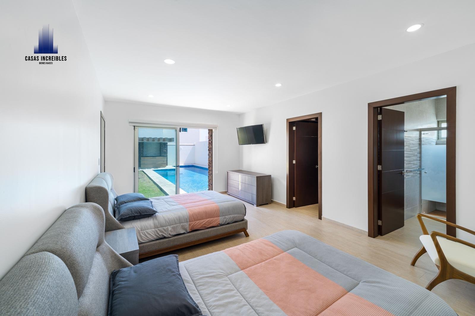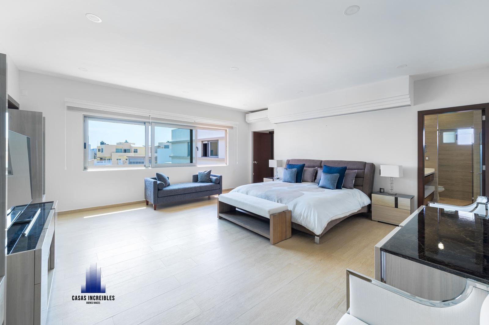 Habitación principal con baño completo forrado en porcelanosa en 3D, cuarzo al rededor de lavabo y doble vestidor, con sala de usos múltiples al interior y vista a alberca