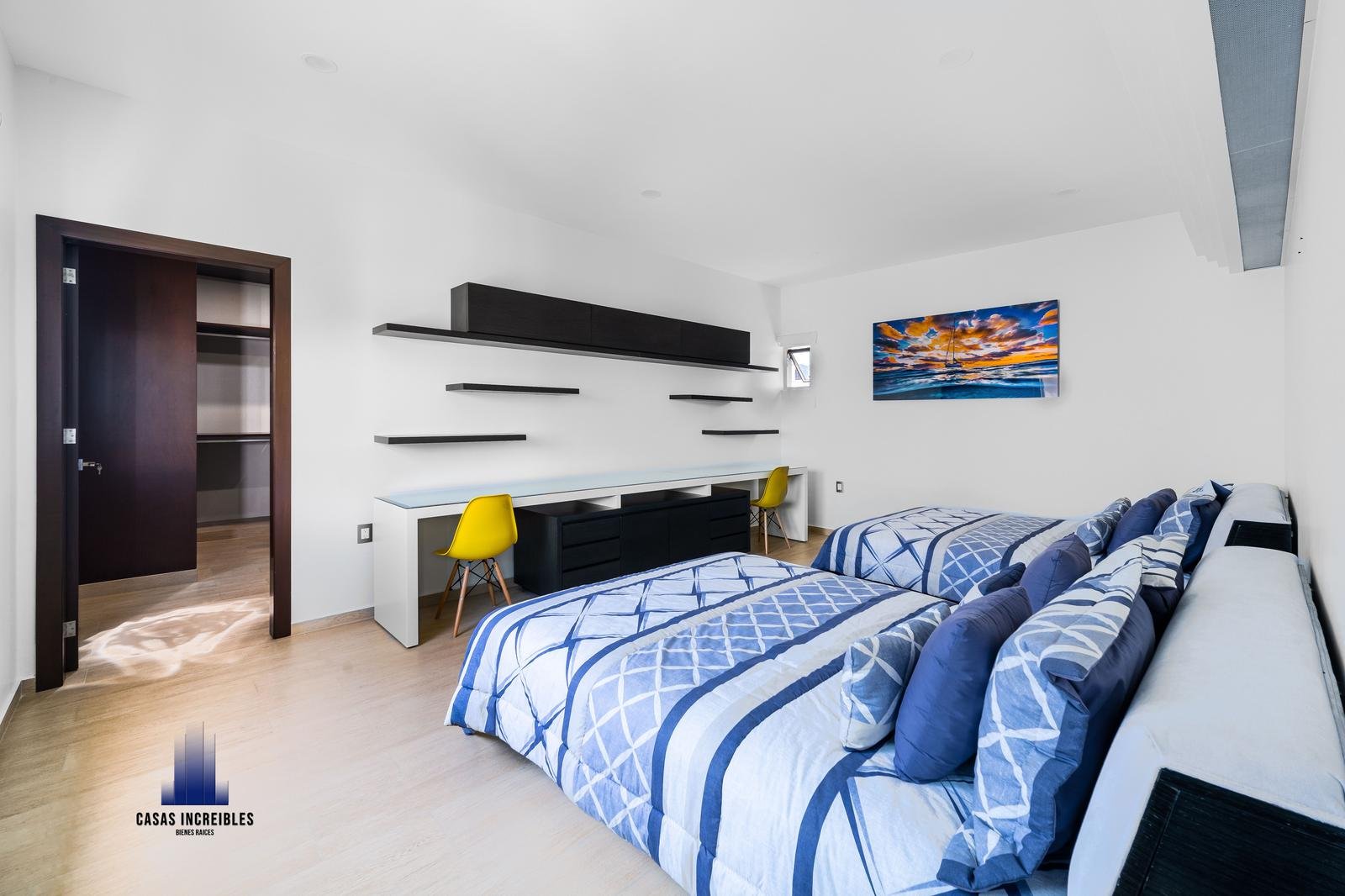 Habitación con baño completo forrado en porcelanosa en 3D lavabo de cuarzo y amplio vestidor