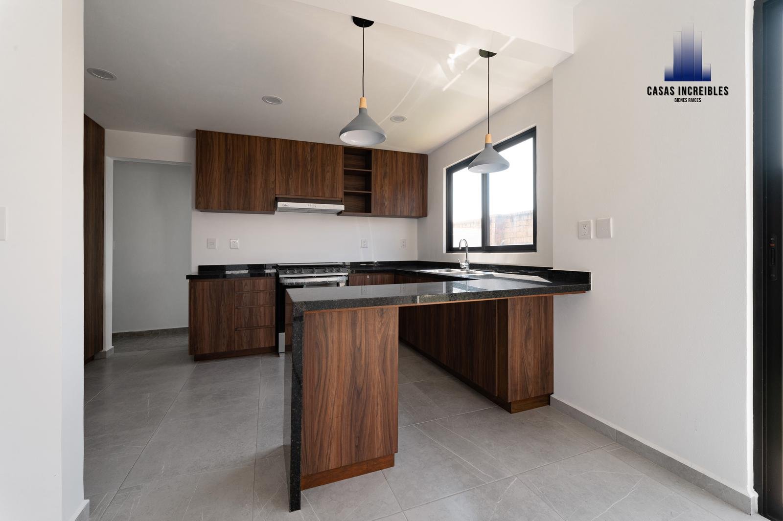 Cocina integral con barra de granito, estufa, campana, alacena, barra desayunador