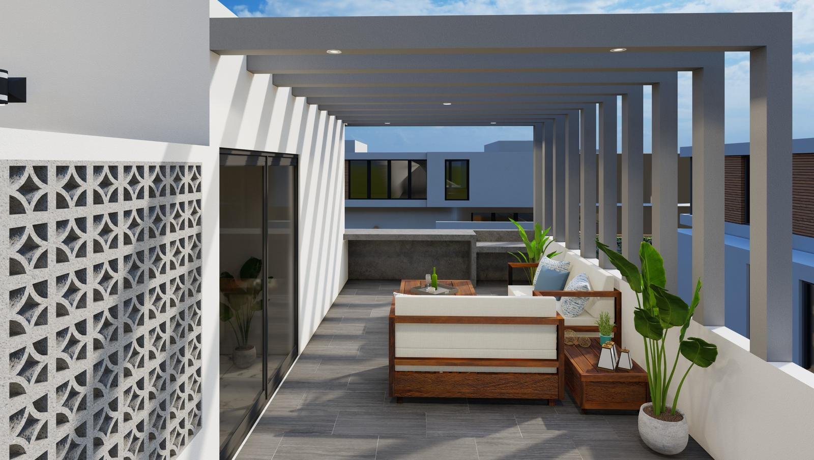 Roof garden con pérgolas y vista panorámica al campo de golf