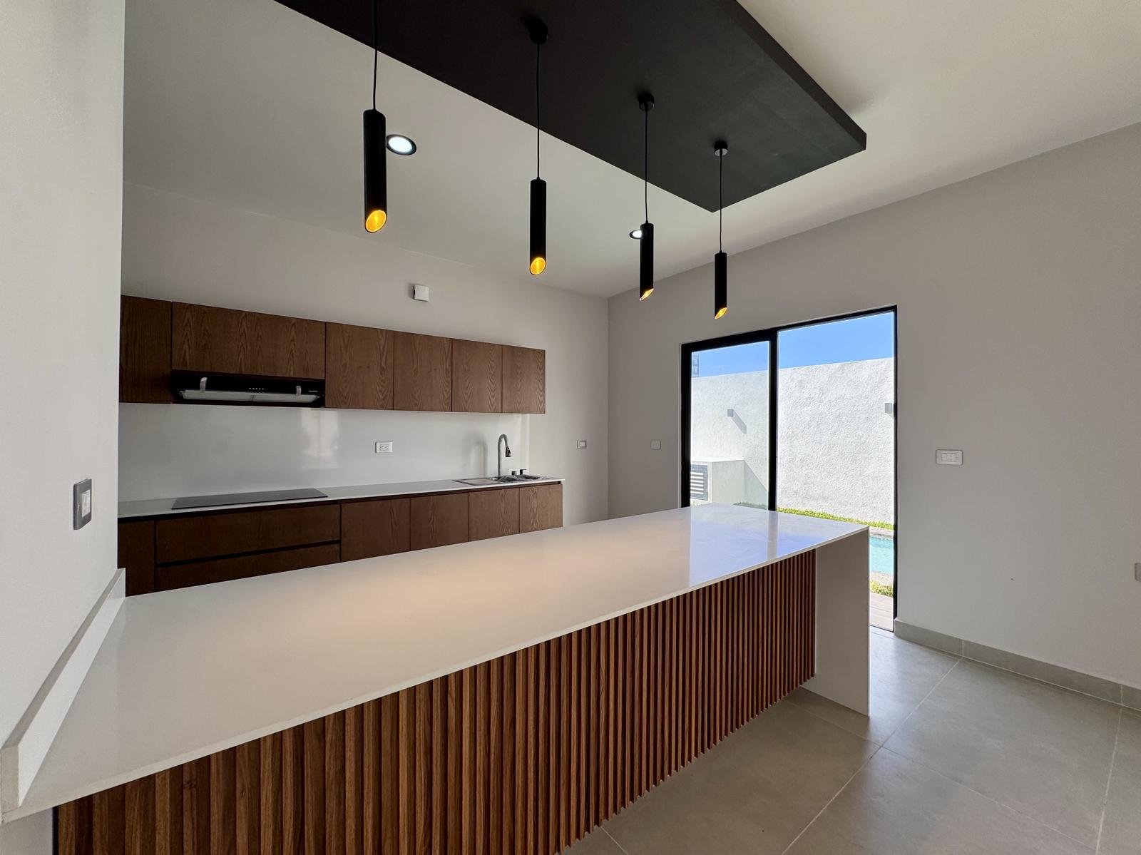 Cocina integral con cubierta de cuarzo, parrilla, campana, torre de hornos y barra desayunador