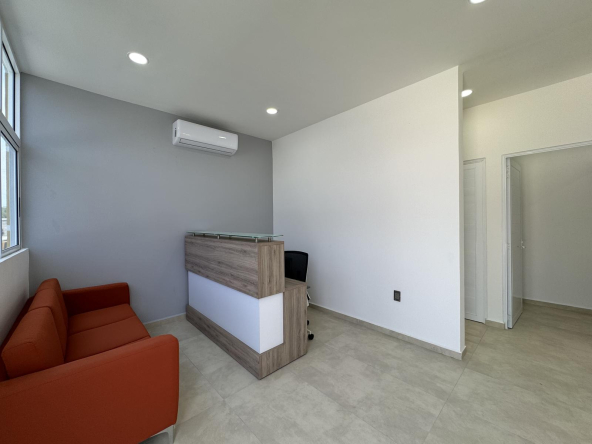 Oficina general amplia con escritorios independientes, archiveros, área de comedor y barra con tarja