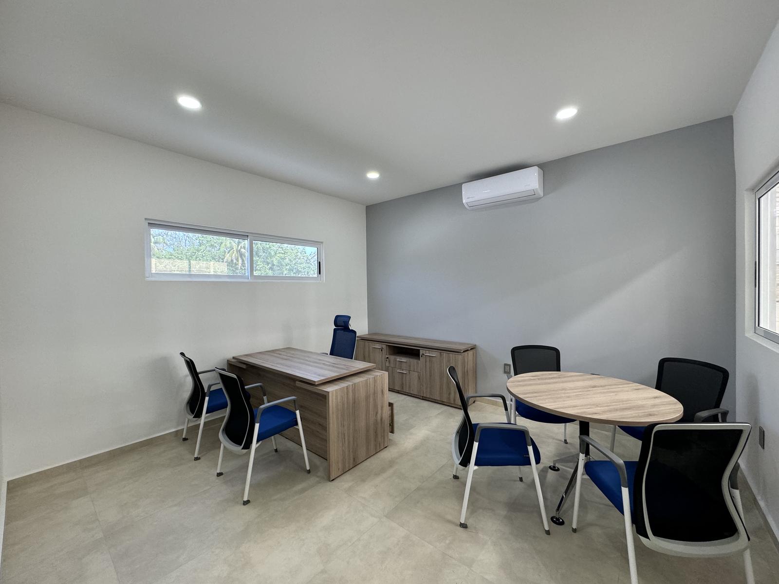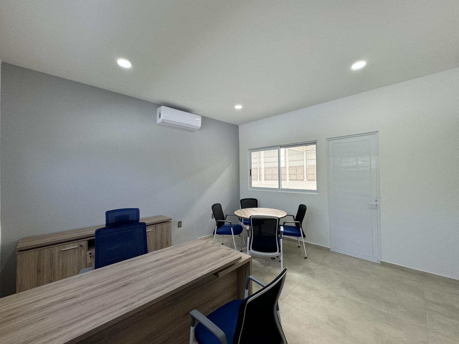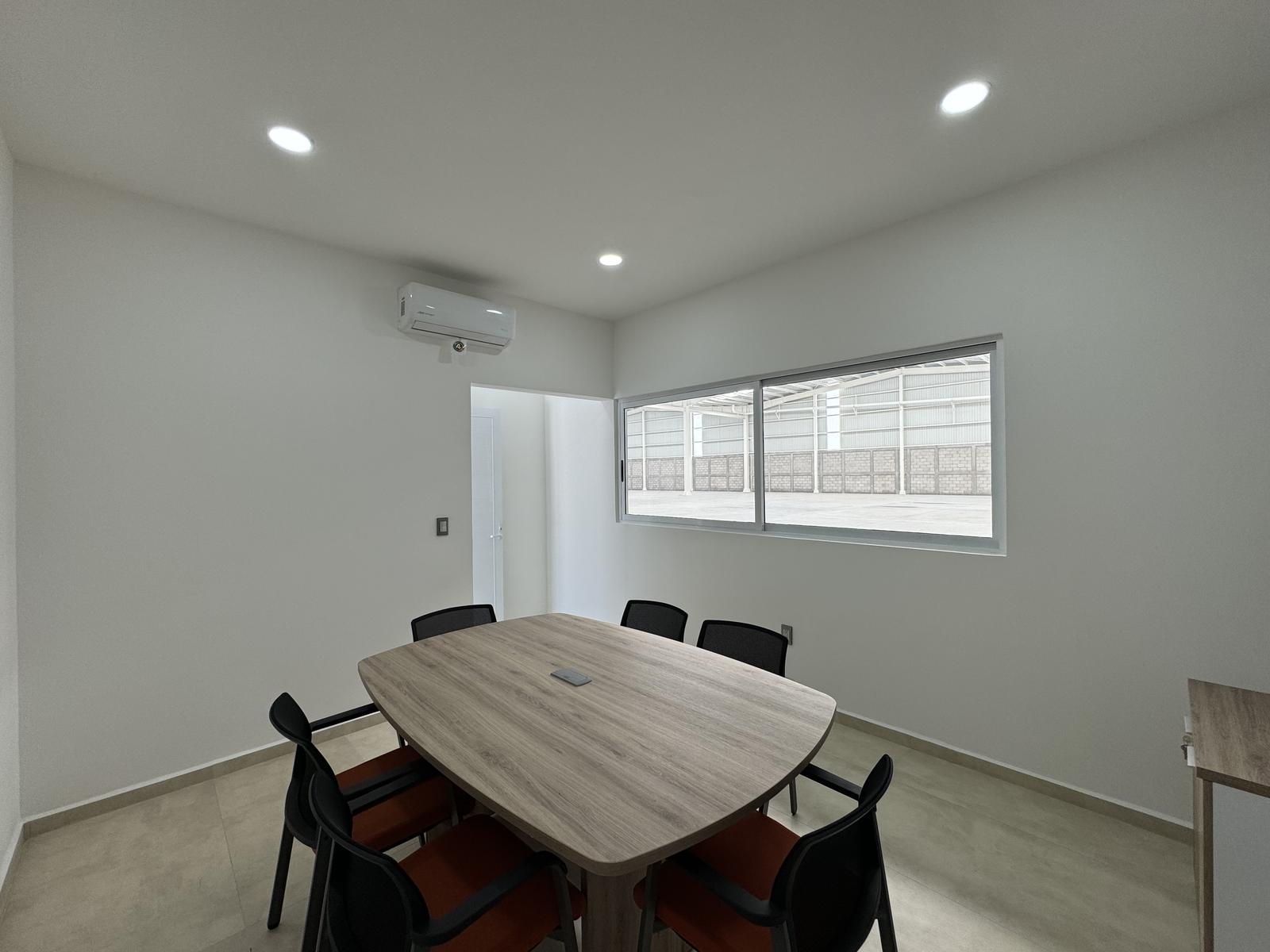 Oficina principal amplia con mesa de juntas y medio baño