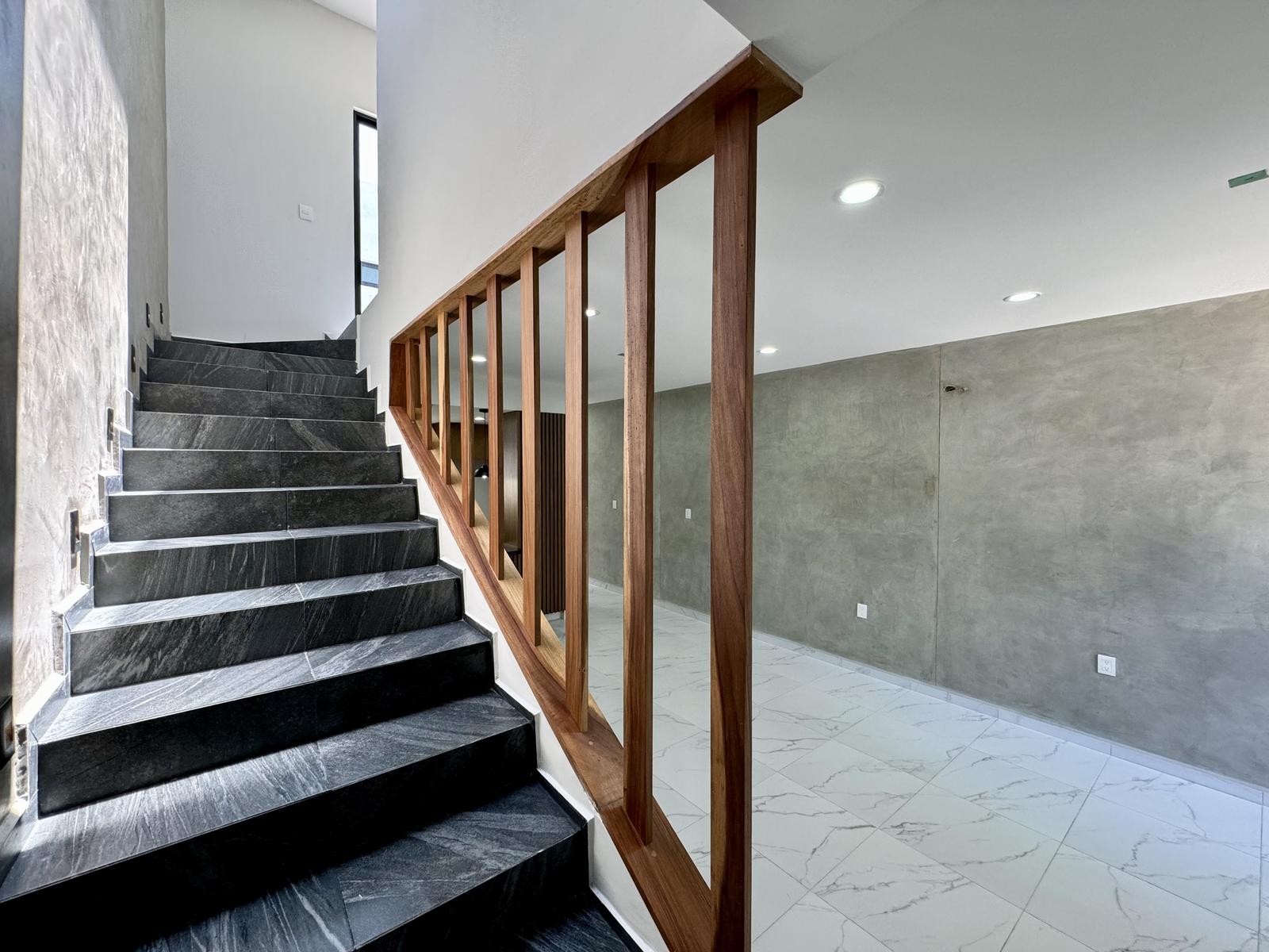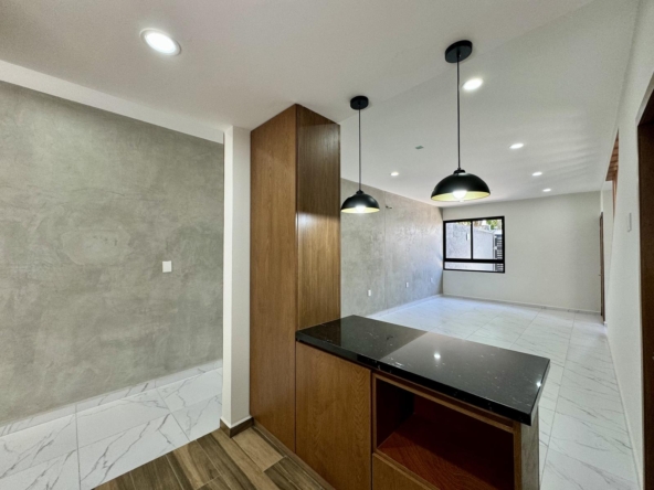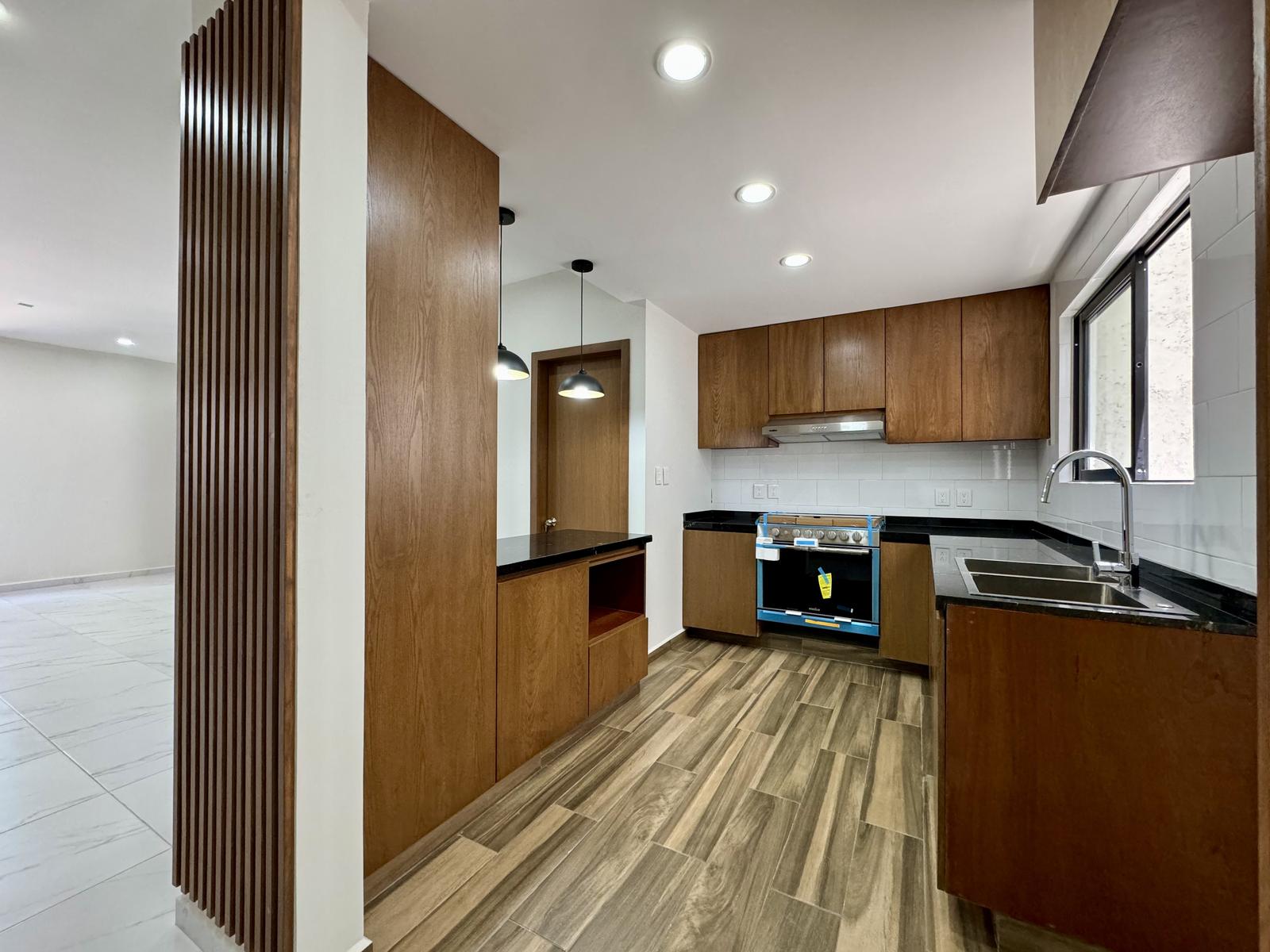 Cocina integral con barra granito, estufa, campana, barra desayunador