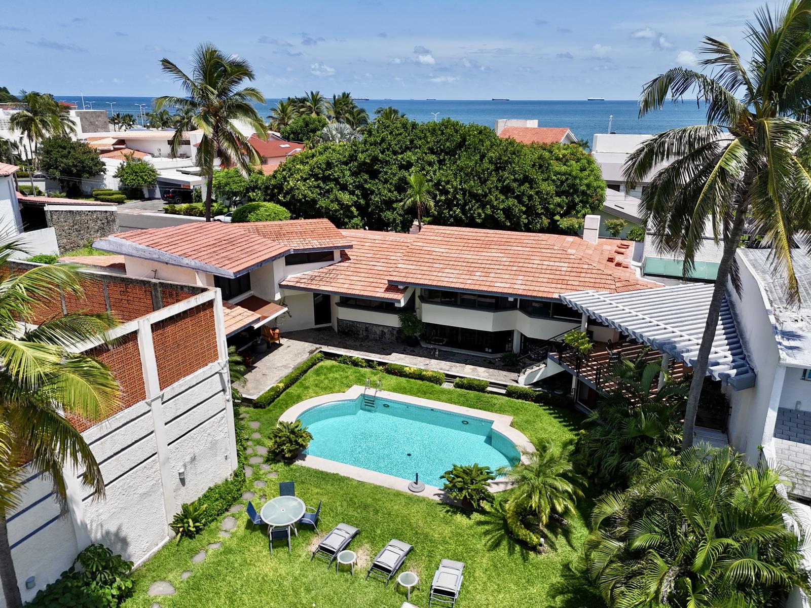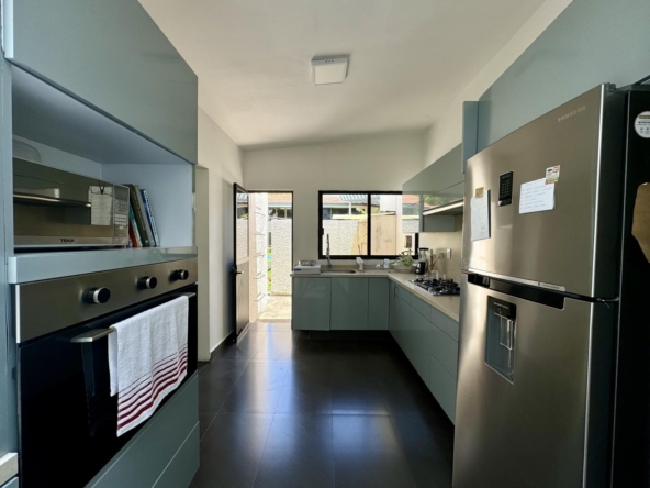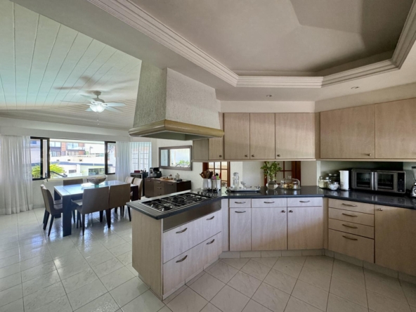Cocina amplia con barra, parrilla, campana, torre de hornos y desayunador