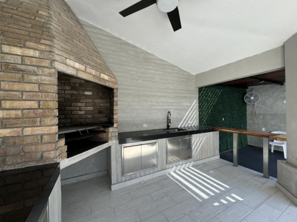 Cocina integral con parrilla, campana, tarja, torre de hornos, alacena, preparación para lavavajillas, e isla de preparación