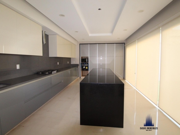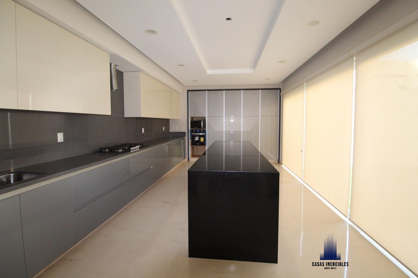 Cocina integral con barra de cuarzo e isla, forrada con paneles de alto brillo, parrilla, campana, horno y alacena