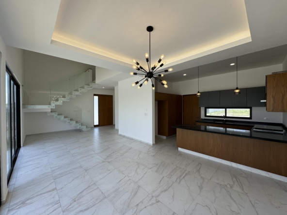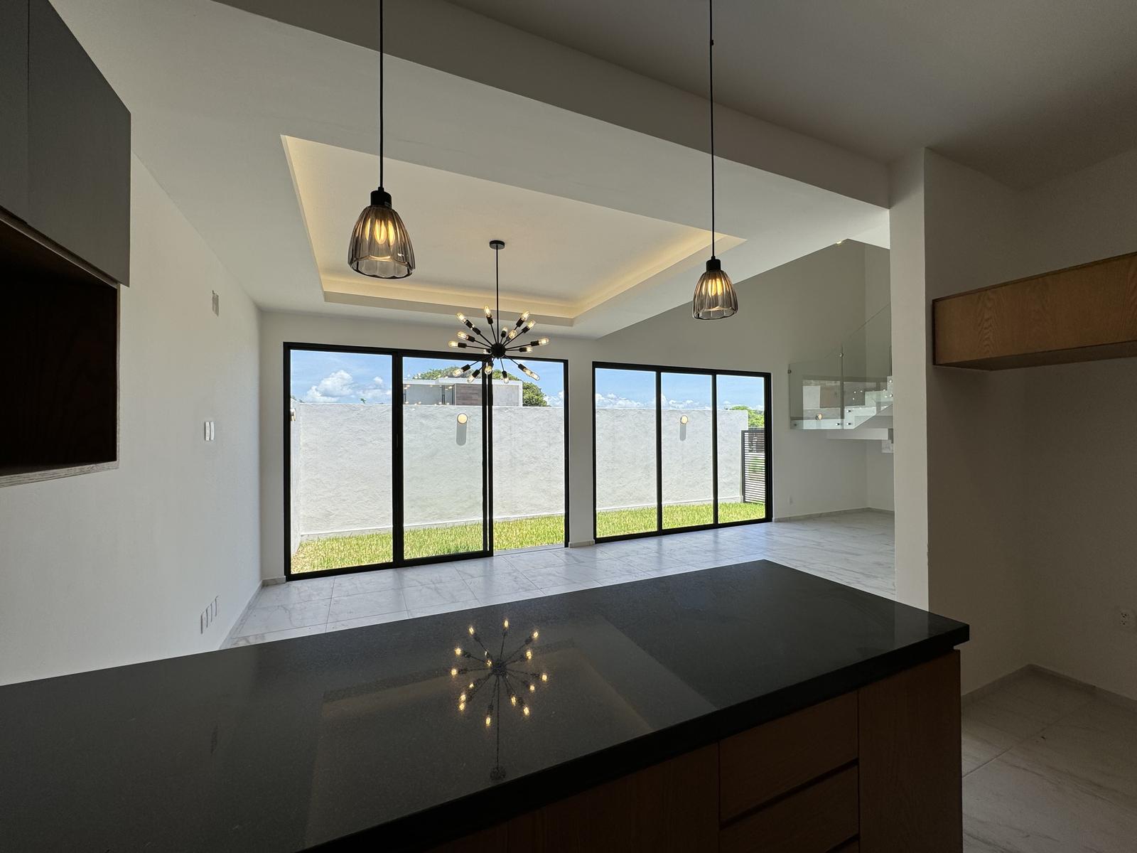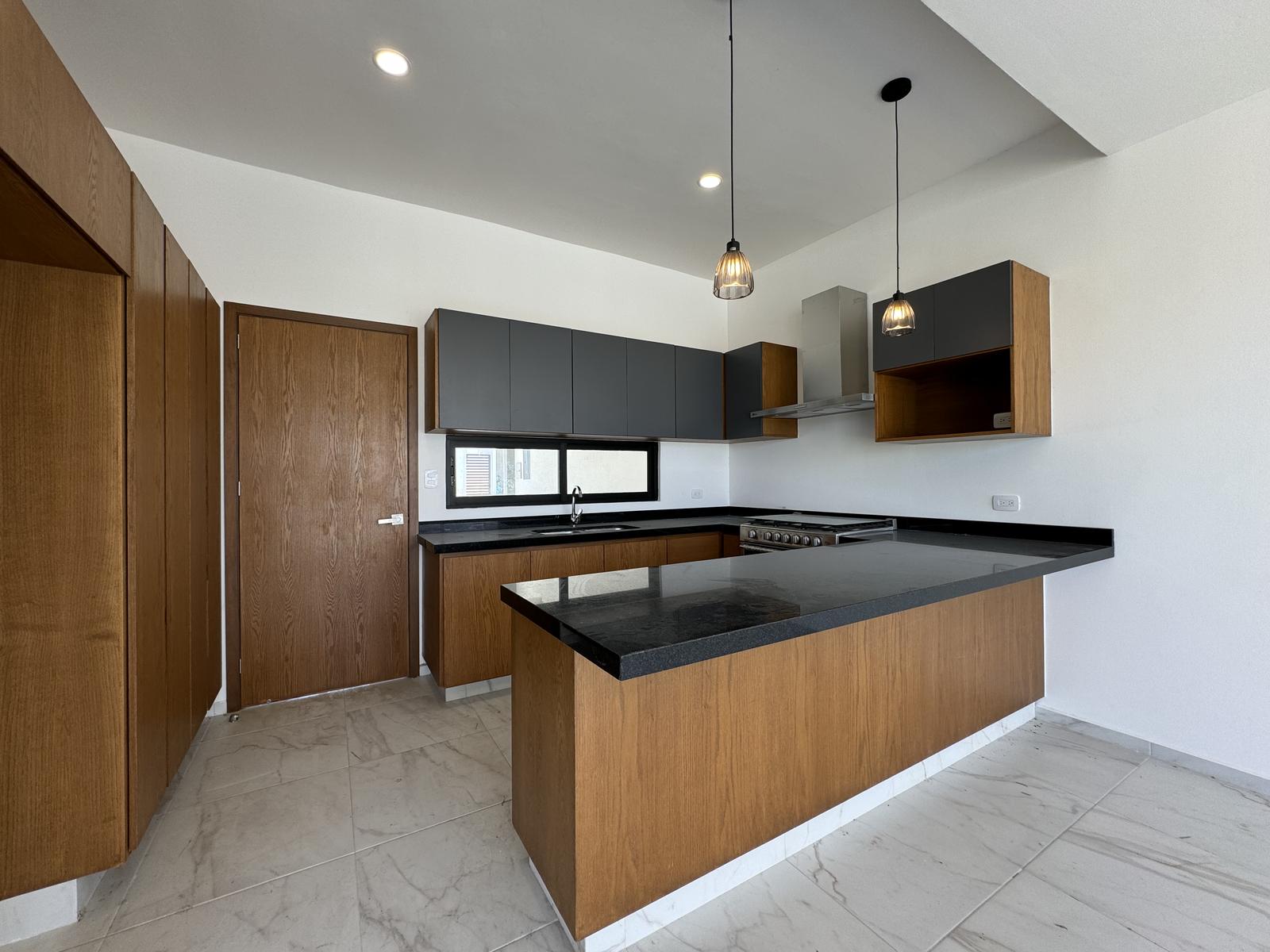 Cocina integral con barra de granito, estufa, campana, alacena y barra desayunador