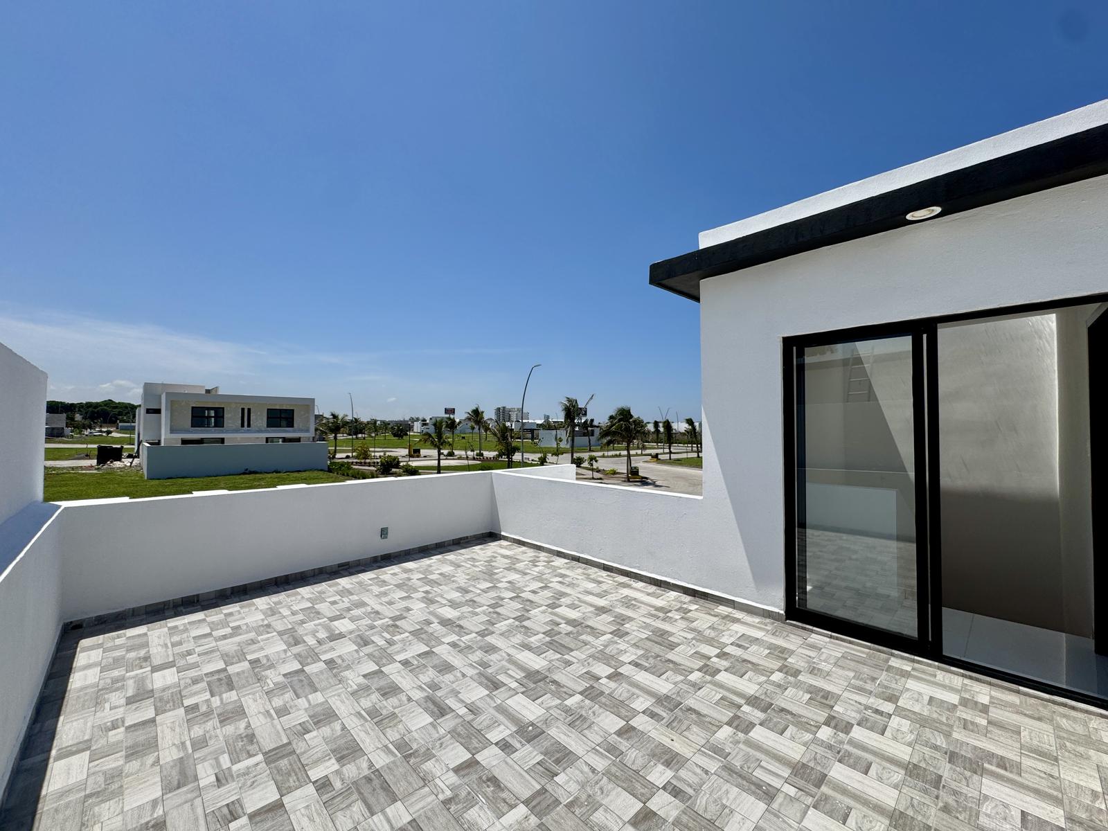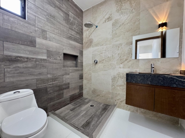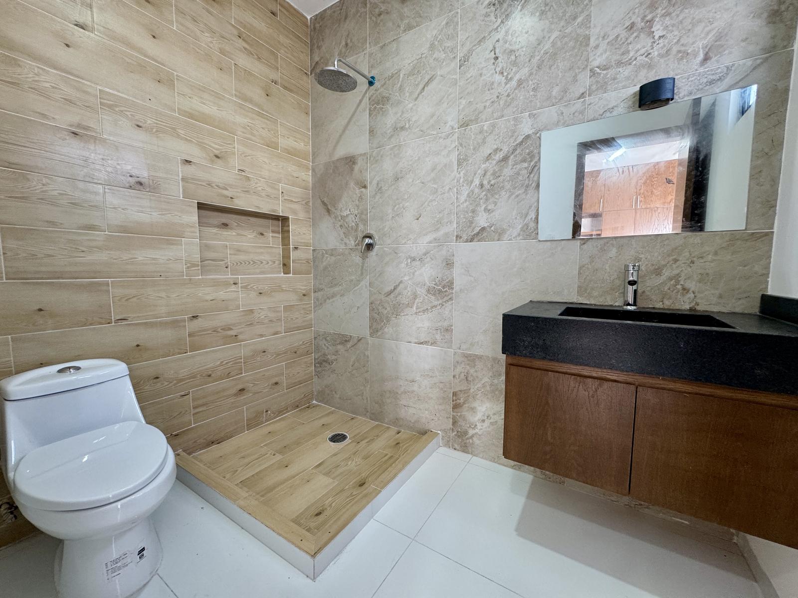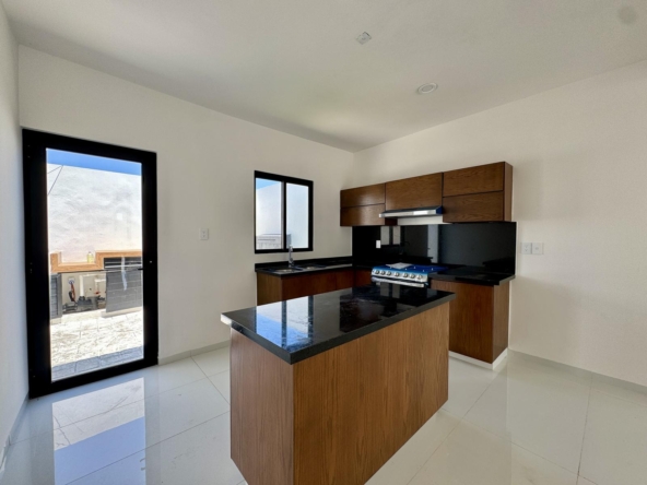 Cocina integral con cubierta de granito, estufa, campana e isla desayunador