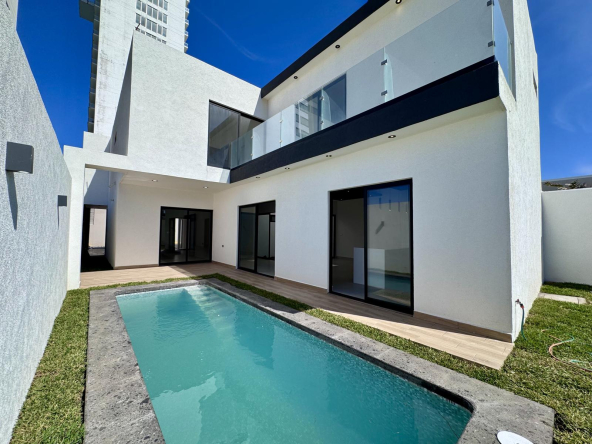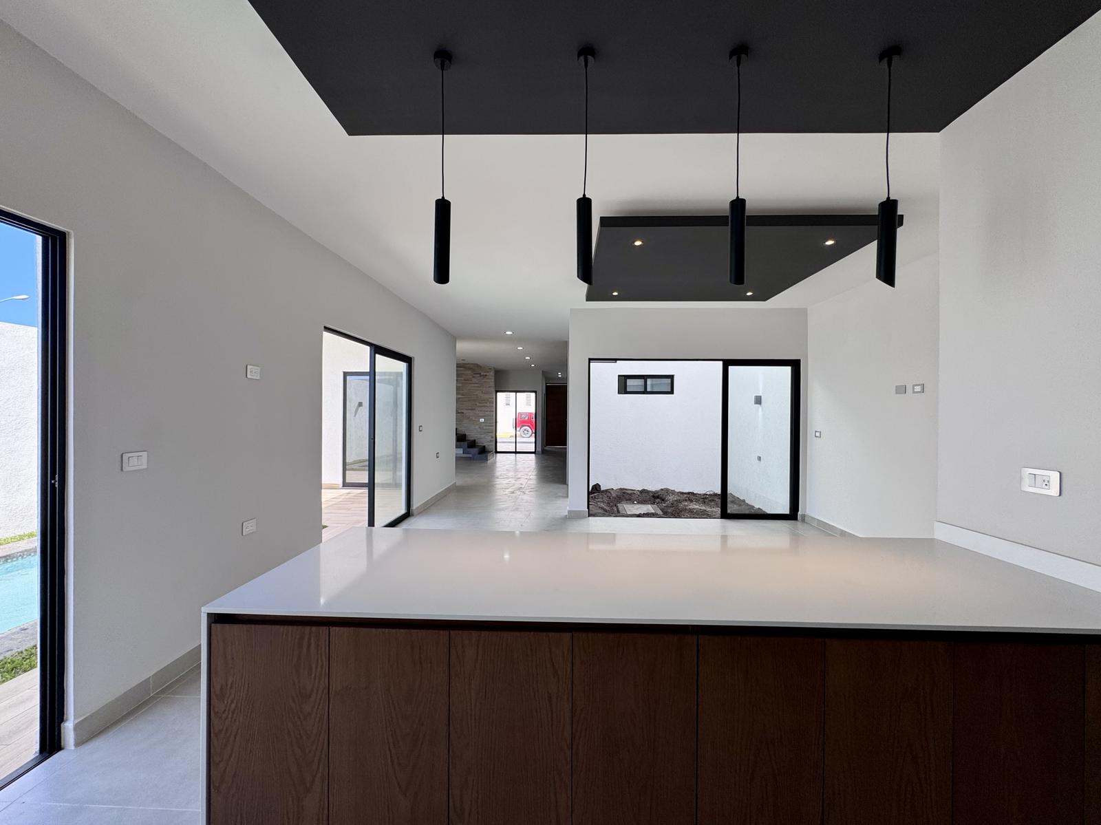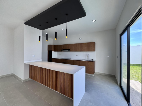 Cocina integral con cubierta de cuarzo, parrilla, campana, torre de hornos y barra desayunador