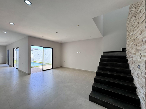 Área de TV con muro decorado en piedra de cantera y closet de blancos con séptico
