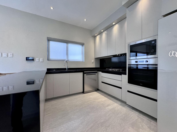 Cocina integral con parrilla, campana, hornos, lavavajillas y barra desayunador