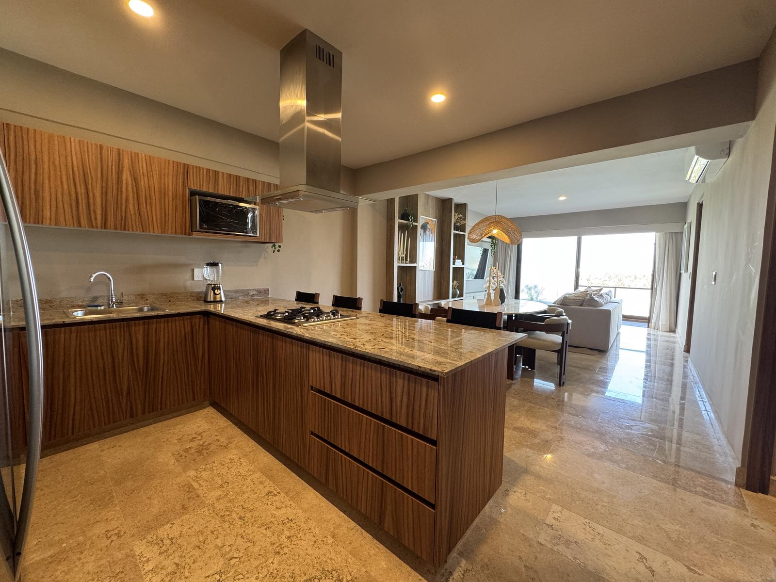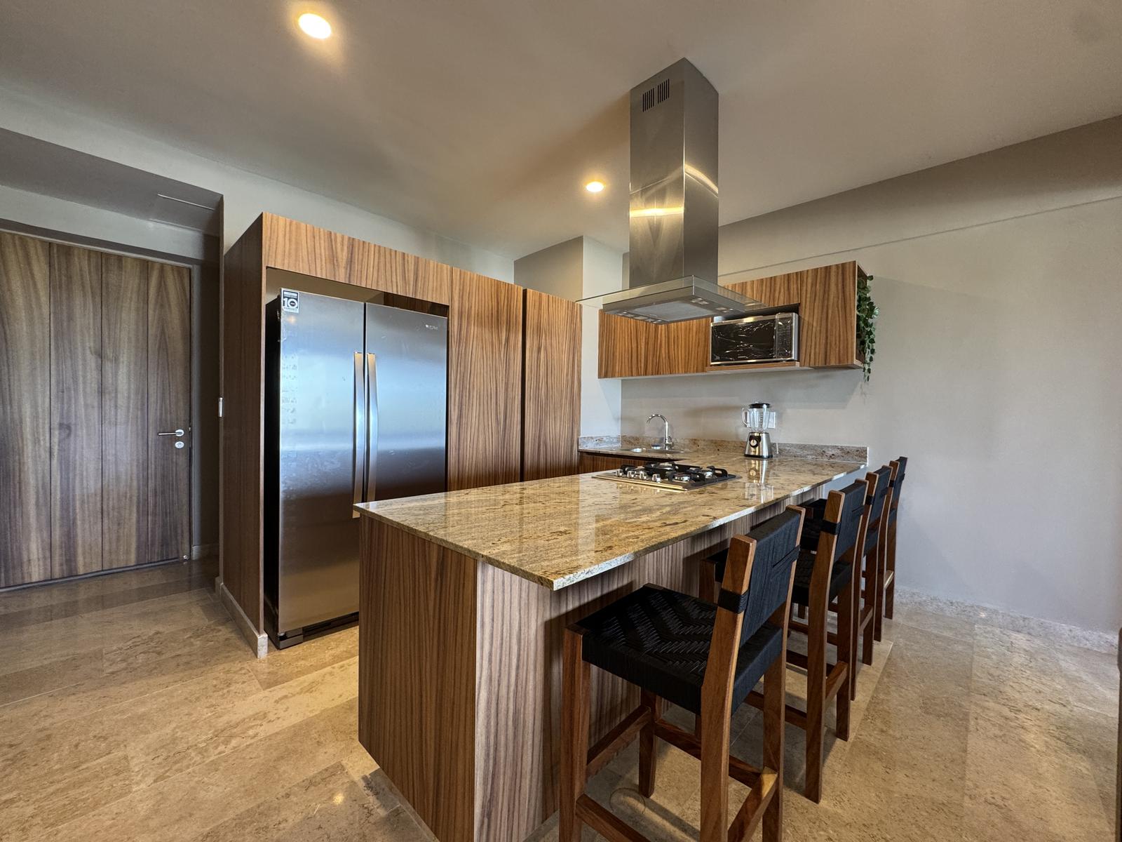 Cocina integral con barra de granito, parrilla, campana, horno y refrigerador