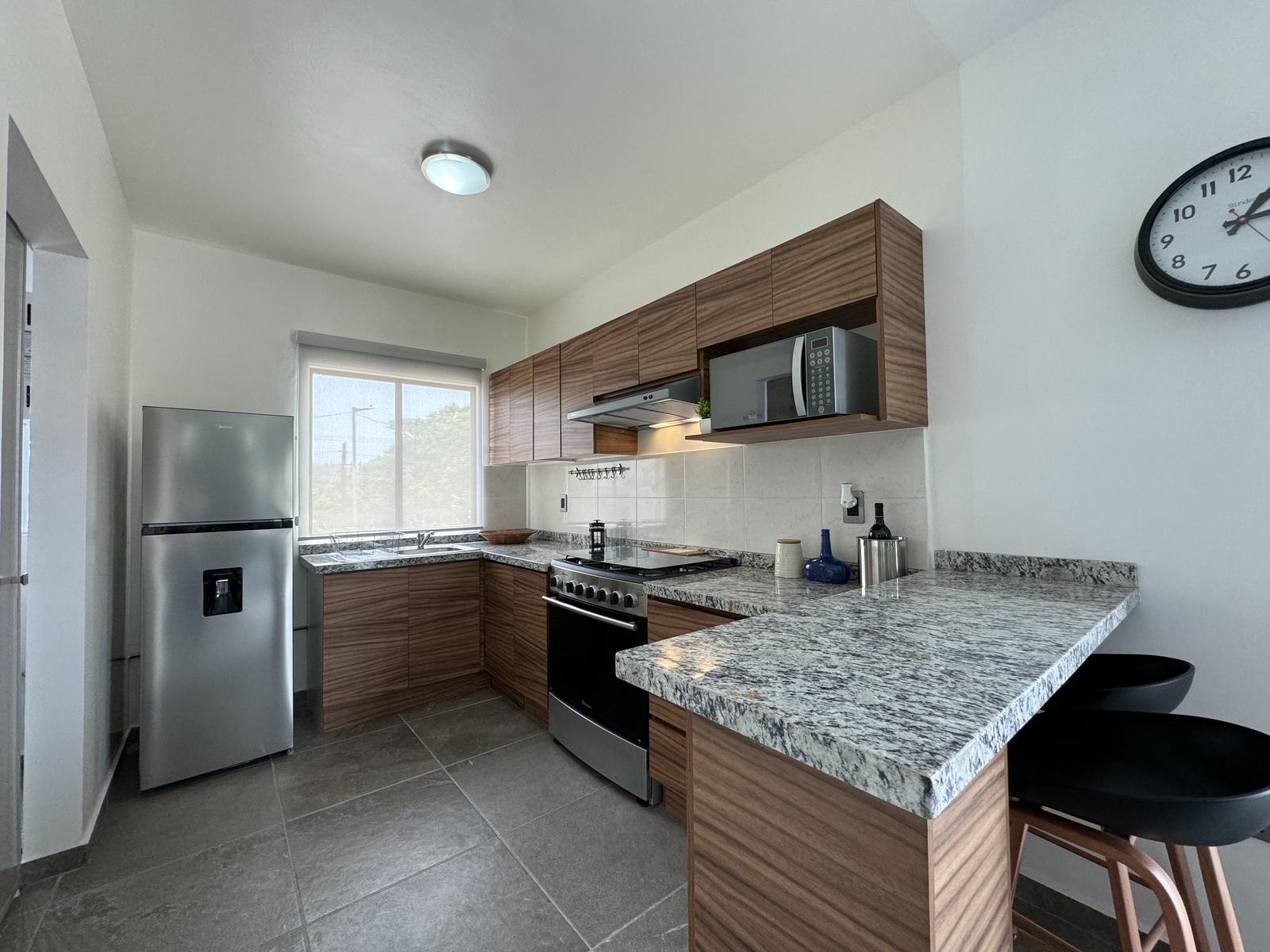 RecibidorSala ComedorCocina equipada con cubierta de granito y barra desayunador 1 Baño completo 1 Habitación con closet1 Habitación con closet Área de lavado1 Cajón de estacionamiento 1 BodegaTanque de gas estacionado por departamento